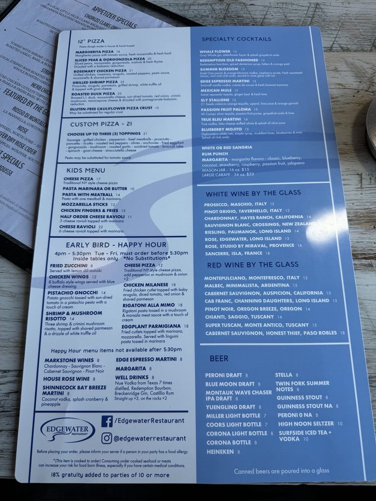 Edgewater Restaurant in Hampton Bays, NY, offers a delightful Italian and seafood menu with a picturesque view of the Shinnecock Bay. Known for its excellent service and beautiful ambiance, this restaurant provides a range of options for vegetarians and also offers wheelchair accessibility. The menu features dishes like tostadas, quinoa salad, frittatas, Chicken Milanese, and a standout Almond Dessert that customers rave about. The lobster pasta is a must-try according to one patron. With options for outdoor seating, a full bar, and happy hour specials, Edgewater Restaurant is a perfect choice for a memorable dining experience. Don't miss out on the bottomless Bloody Marys and the fantastic Negroni. Whether it's a casual dinner or a special gathering, Edgewater Restaurant promises a near-perfect experience with delectable food and impeccable service. Highly recommended for a satisfying dining experience.